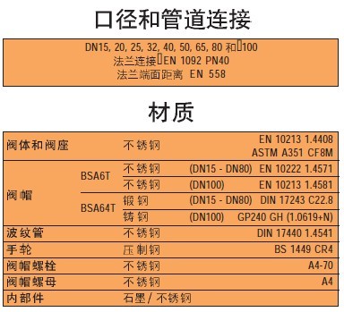 BSA型波纹管密封截止阀的口径从DN15~DN250,可提供各种不同的材质,从铸铁材质的BSA1T,球墨铸铁的BSA2T和铸钢材质的BSA3T型截止阀,连接标准有法兰、螺纹和承插焊等,压力等级可达PN40,ANSI 300和CLASS 800。最高工作温度可达425℃。可用于高温系统.从而用一种阀即可淮足各种不同的工业应用要求,并确保长的使用寿命、免维修及坚固结实..